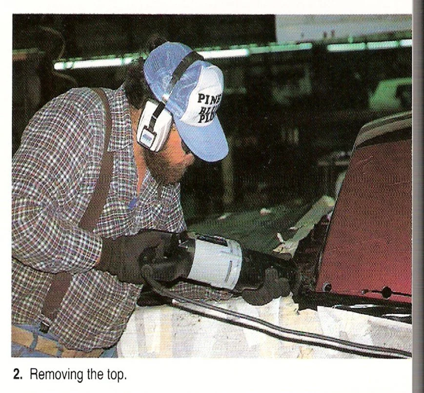 The car, complete except for backseat and headliner, rolls to Station 1. Here, the front seats and remaining trunk and interior trim pieces are removed and the car body is covered for protection. Almost immediately, the top of the car is removed. Using three separate tools, an air shear, air chisel and reciprocating saw, two workers actually cut off the top of each Riviera.
