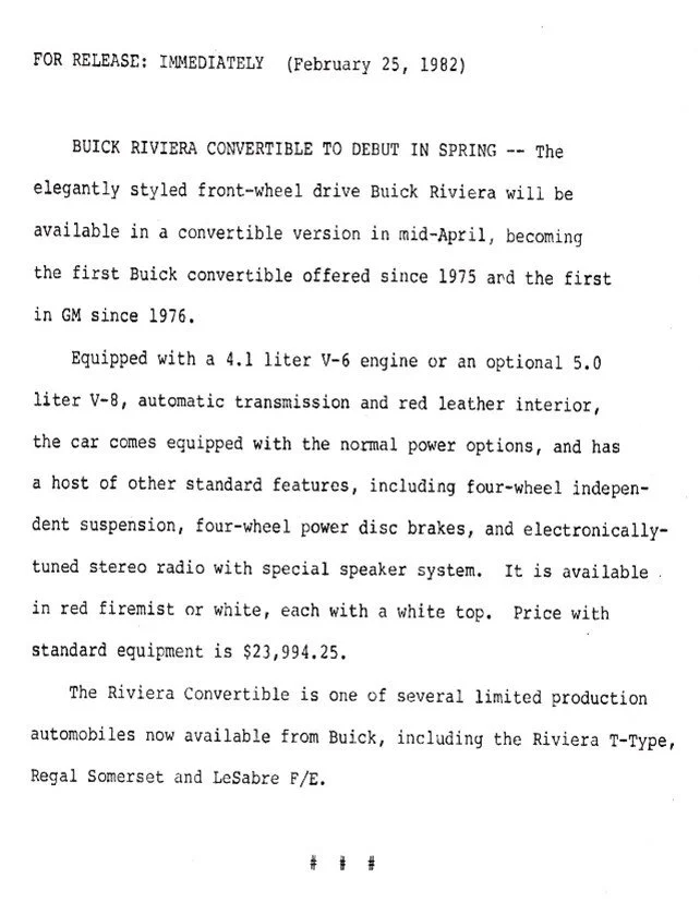 On February 25, 1982, a press release was sent out to all dealers. The all new, limited production, Buick Riviera Convertible will debut in the spring, mid-April 1982. Available in two colors only; White or Red Firemist Metallic with a Maple / Claret Leather Interior with a White Vinyl Top. Most never made it to dealers lot before mid to late July of that year and all featured the new updated 1983 Riviera Grill. This was a very well appointed automobile by 1982 standards and the price reflected it.