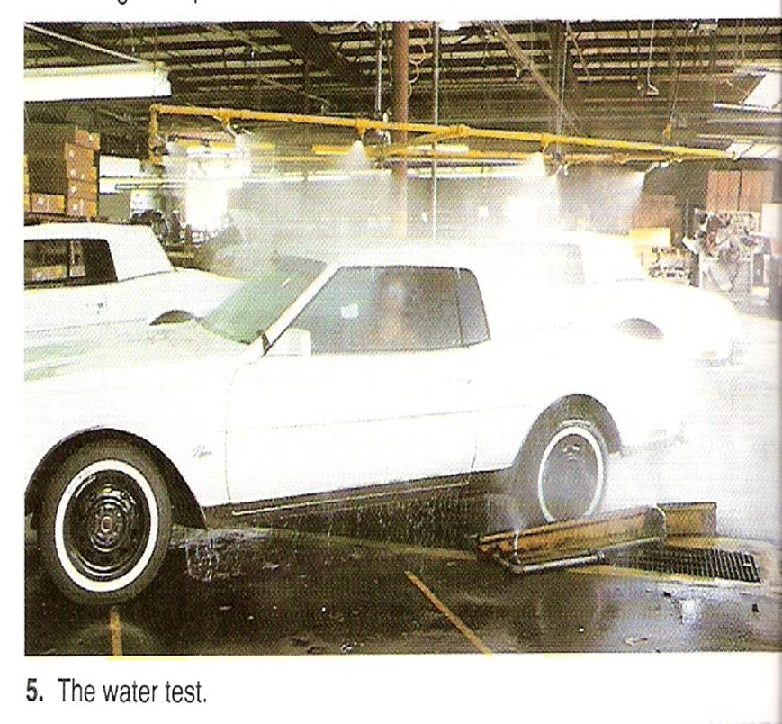 After yet another inspection, the underbody weld areas are undercoated and the the convertible is ready for the test of tests...the water test. In a period of four minutes, 350 gallons of water are sprayed on the car from above and below. An inspector inside the car checks for leaks. If repairs are necessary, they must be made and the car must pass the water test again before moving on.